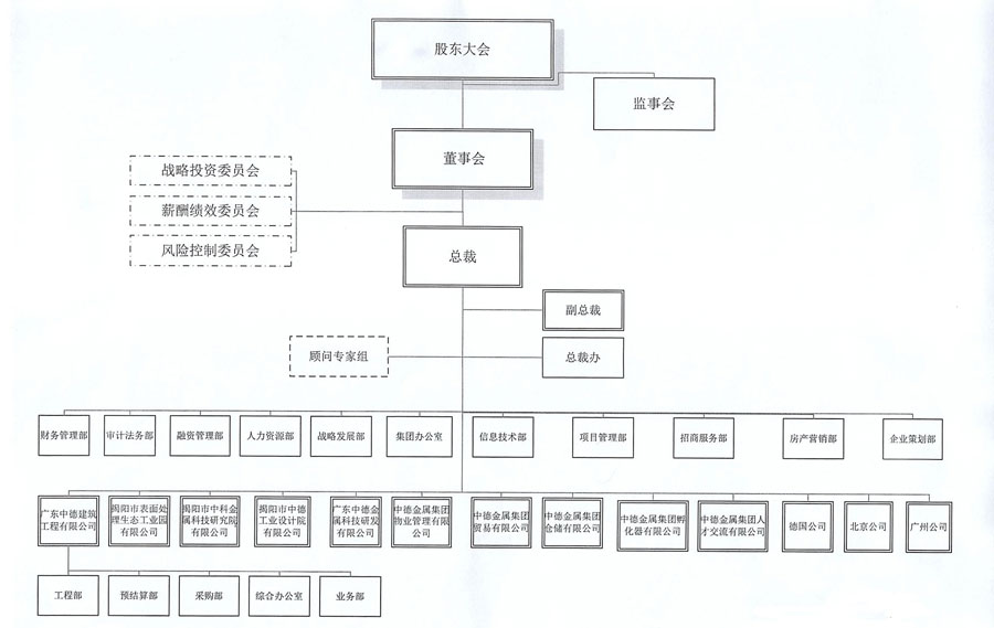 中德金屬集團(tuán)按“三會一層”的管理思想,組建了職能完善、結(jié)構(gòu)清晰的組織架構(gòu)。在經(jīng)營層面,以總裁為核心,成立了集團(tuán)辦公室、戰(zhàn)略發(fā)展部、人力資源部、融資管理部、審計(jì)法務(wù)部、財(cái)務(wù)管理部、信息技術(shù)部、項(xiàng)目管理部、招商服務(wù)部、房產(chǎn)營銷部、企業(yè)策劃部等十一個核心職能部門。同時(shí),下轄十三家子公司。