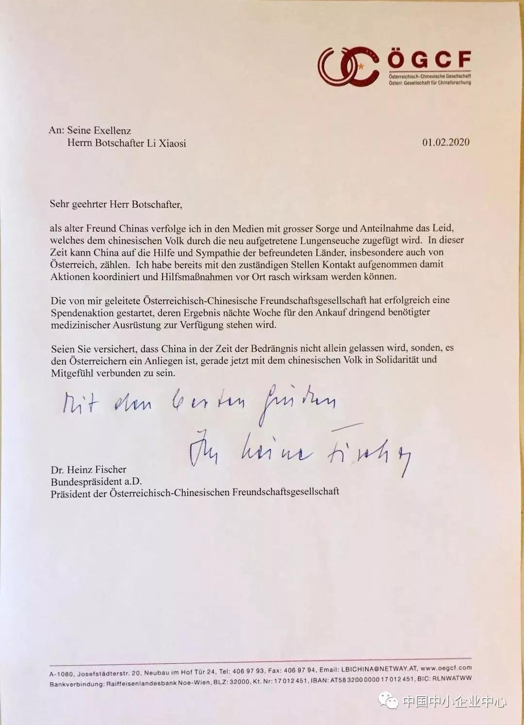 在致李曉駟大使的信中,菲舍爾前總統(tǒng)表示:作為中國的老朋友,我懷著擔(dān)憂和關(guān)切的心情在媒體上跟蹤新型冠狀病毒肺炎疫情帶給中國人民的不幸。在這一時刻,中國可以指望友好國家,特別是奧地利的同情和幫助。我已與主管部門進(jìn)行聯(lián)系,推動協(xié)調(diào)各方行動,使援助措施能夠盡快發(fā)揮作用。我領(lǐng)導(dǎo)的奧中友協(xié)組織的捐助行動已經(jīng)成功開始,下周將用于采購急需的醫(yī)療物資。請您放心,中國在危機(jī)時刻并不孤單。此時此刻奧地利人民與中國人民感同身受、團(tuán)結(jié)一致。