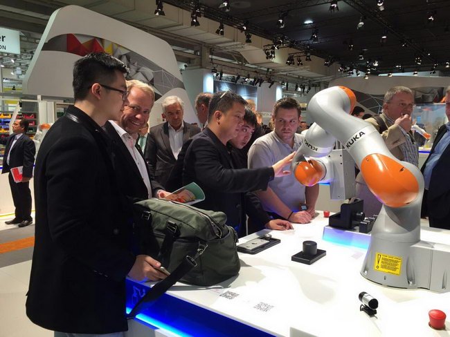 KUKA 公司設(shè)計(jì)的自主移動(dòng)機(jī)器人,既可作為工業(yè)生產(chǎn)助手,也可作為家務(wù)助手,成為考察團(tuán)的一大看點(diǎn)