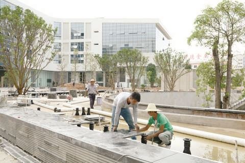 鋪貼石板、種植綠化、修筑景觀水池……國(guó)慶期間,中德金屬生態(tài)城四大中心工程中庭園林施工現(xiàn)場(chǎng)一派繁忙,工人有條不紊地推進(jìn)各項(xiàng)施工。